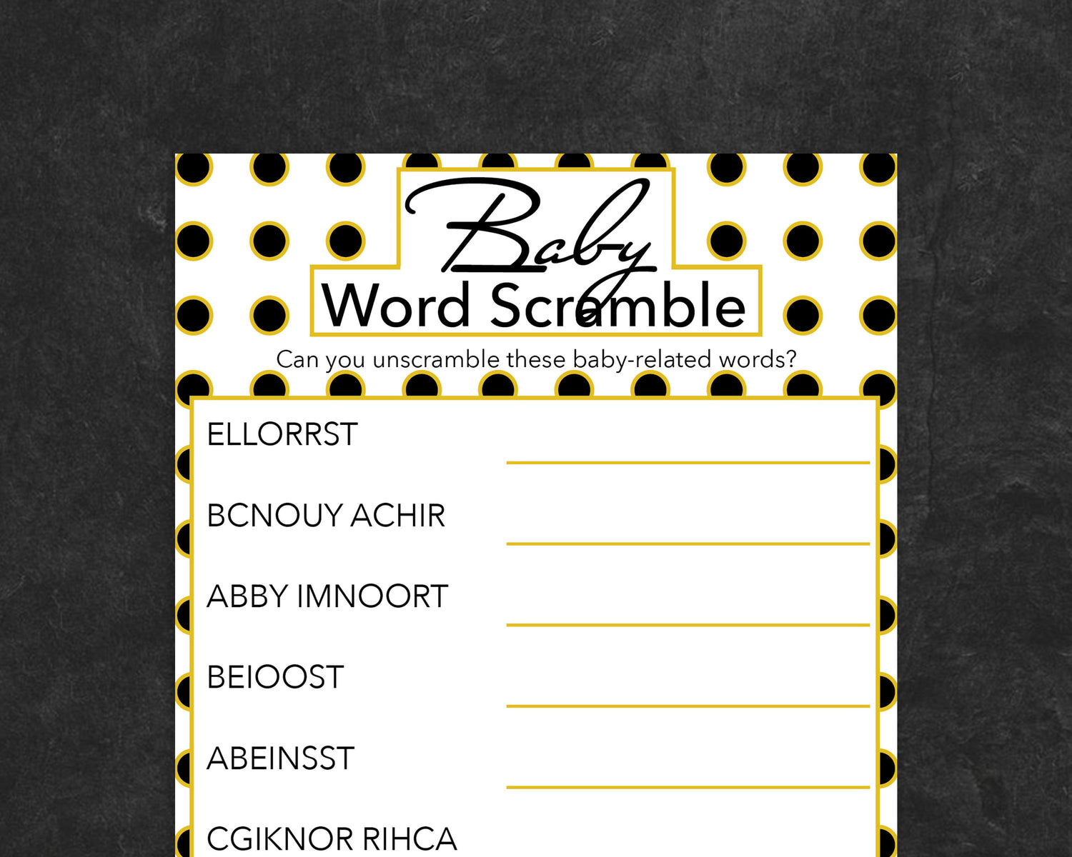 - Print-at-home PDF game cards to fit a polka dot wedding shower game theme