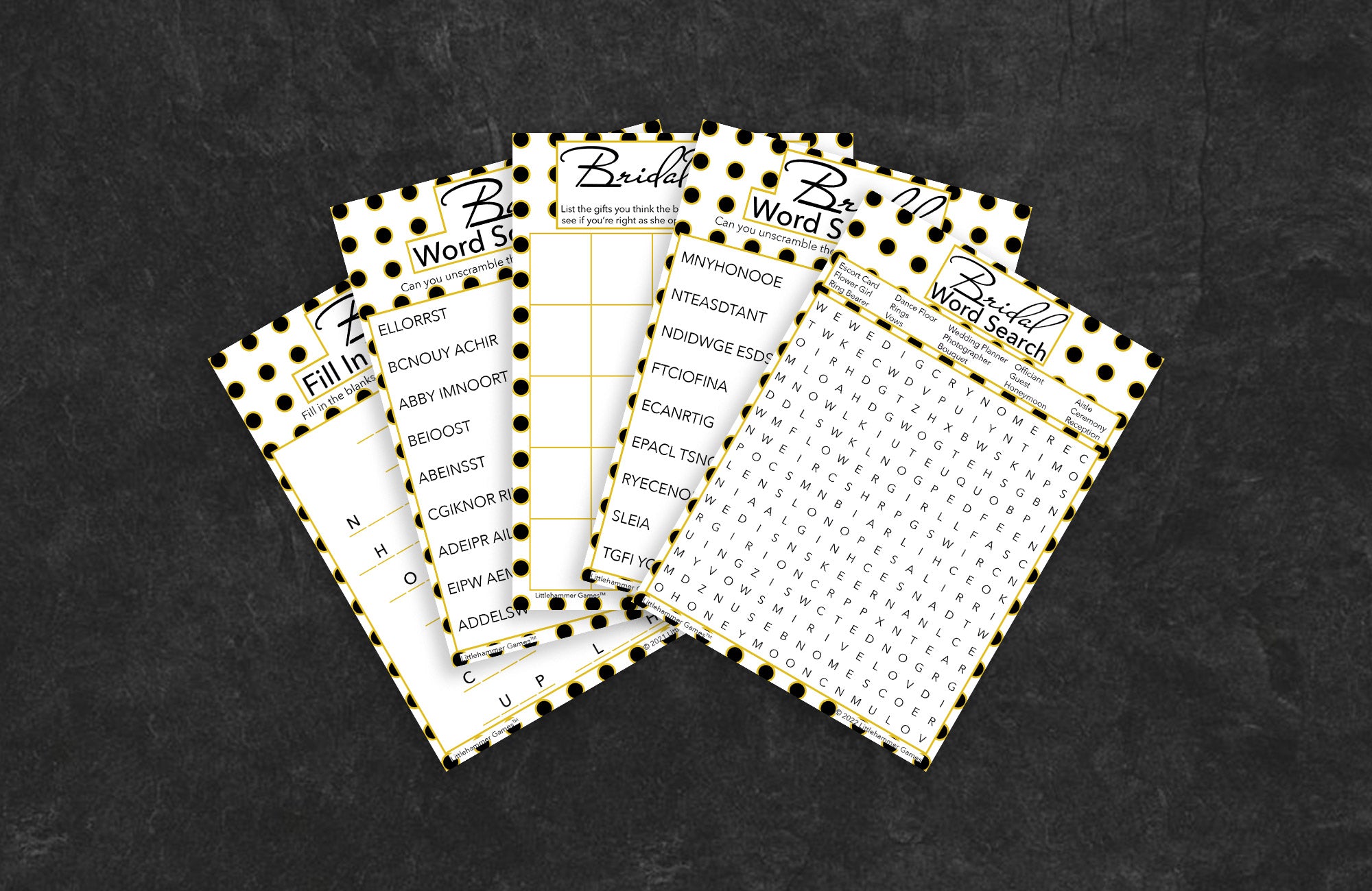 We've got your back. With Littlehammer Games, you can entertain all your guests and please the bride-to-be at the same time. Our Bridal Word Search game with printable game cards is a race among all your guests to find wedding-themed words and phrases.