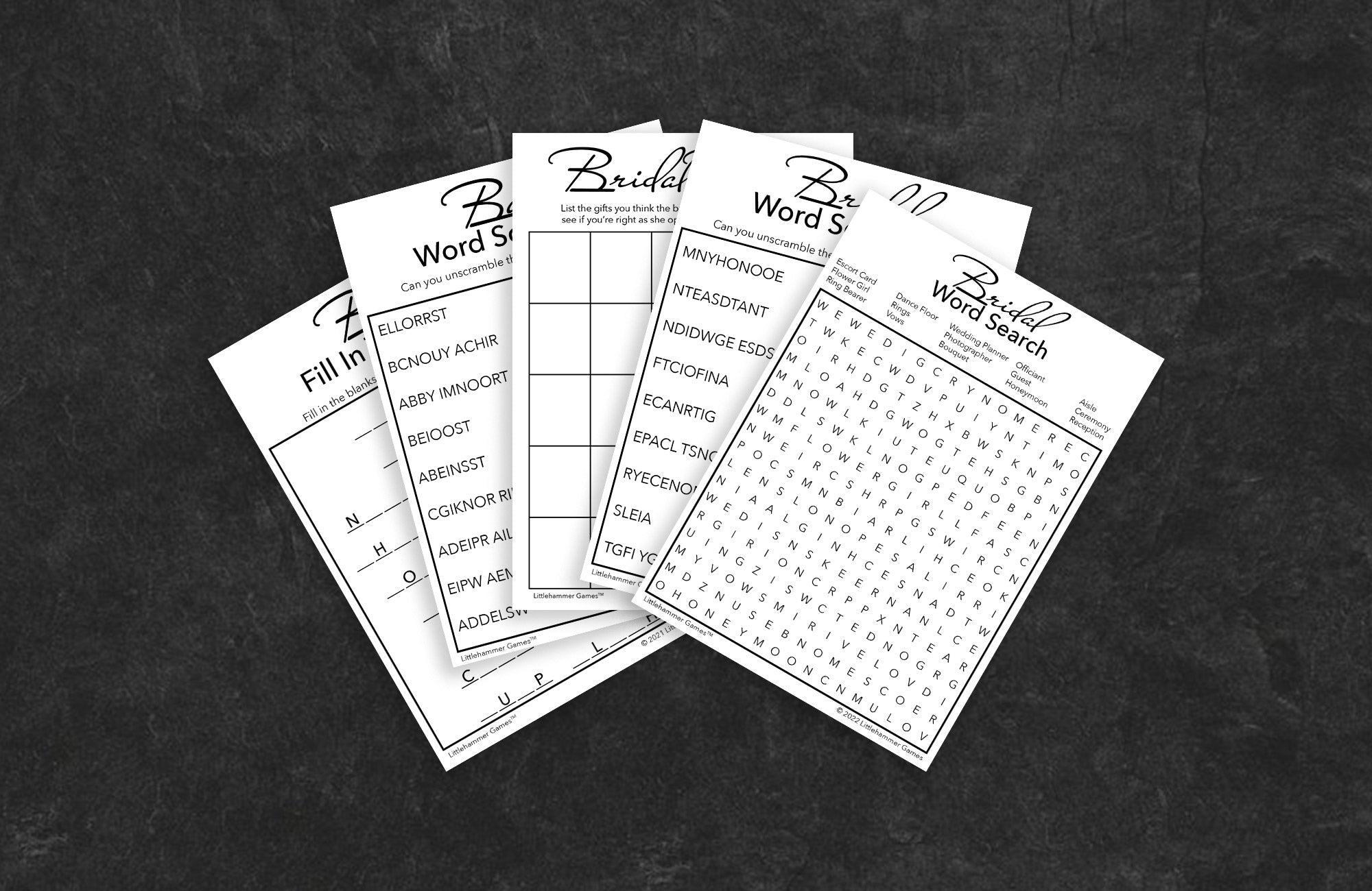 We've got your back. With Littlehammer Games, you can entertain all your guests and please the bride-to-be at the same time. Our Bridal Word Search game with printable game cards is a race among all your guests to find wedding-themed words and phrases.