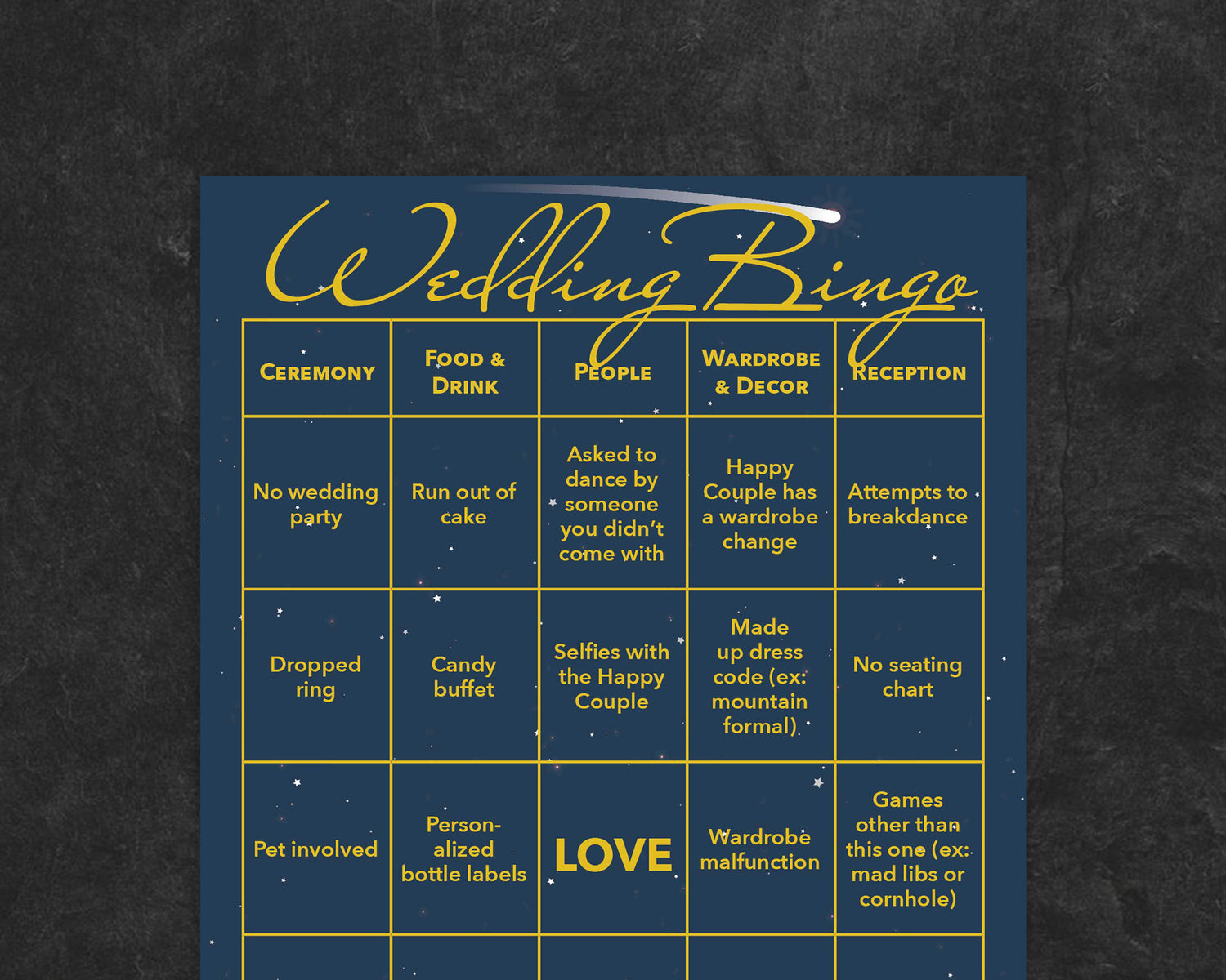 Your guests play Wedding Bingo by paying attention to everything around them. They will celebrate the good (delicious food!), endure the bad (in-laws fighting), and get a kick out of the cliche (members of the wedding party making out) with Wedding Bingo.